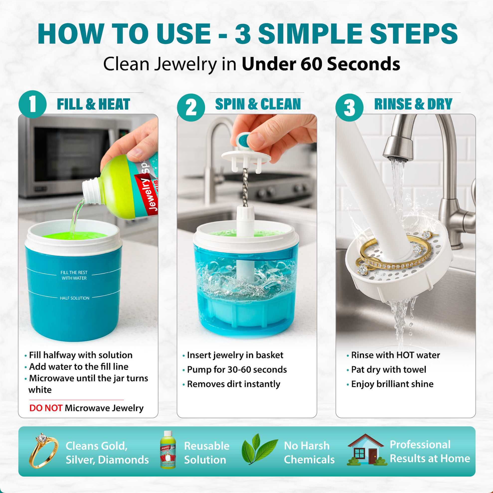 Restore your tarnished, dull jewelry to sparkling brilliance in just 3 easy steps. Safe for your most precious pieces - engagement rings, heirlooms, gold, silver, diamonds, pearls, and more.