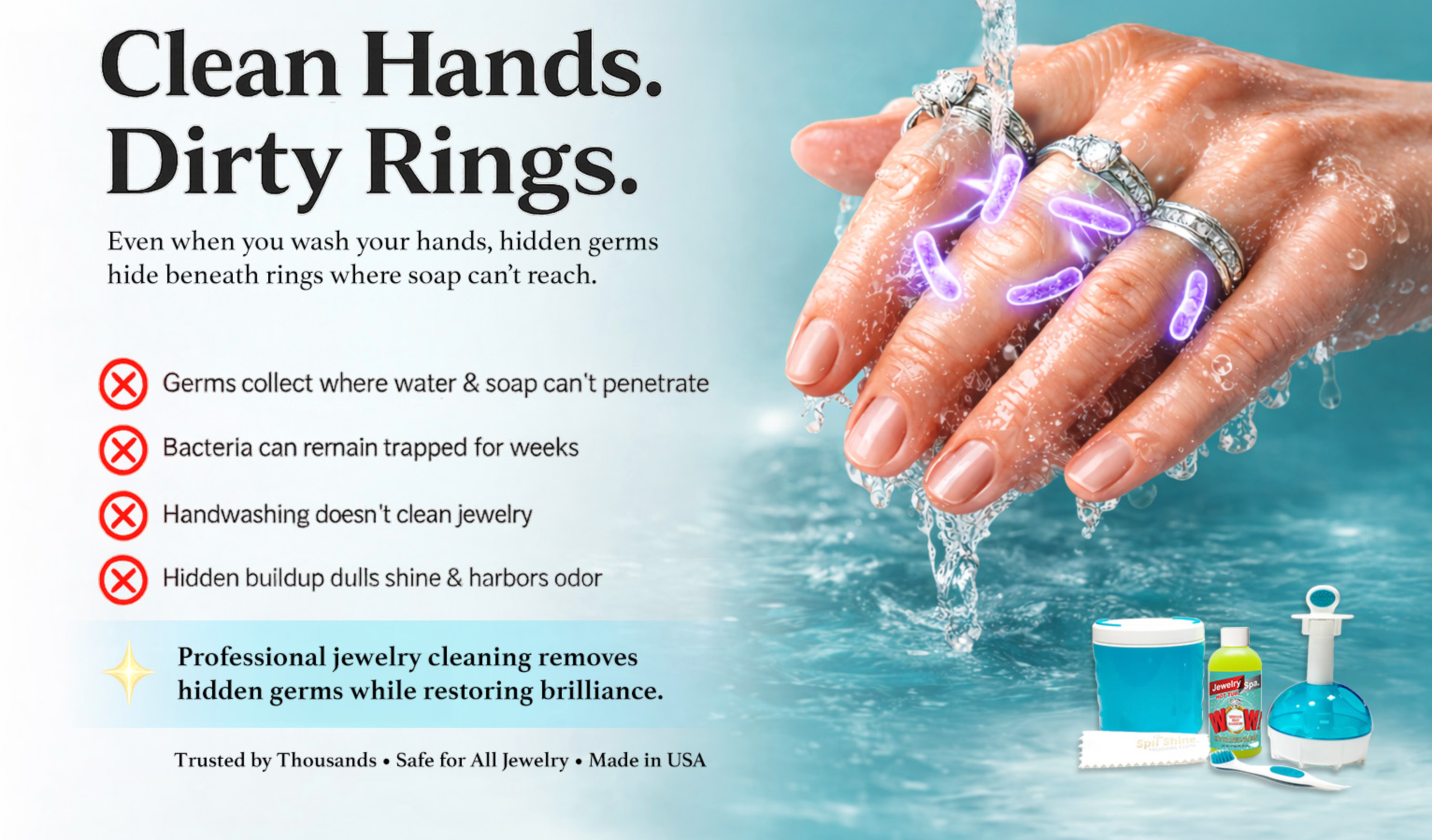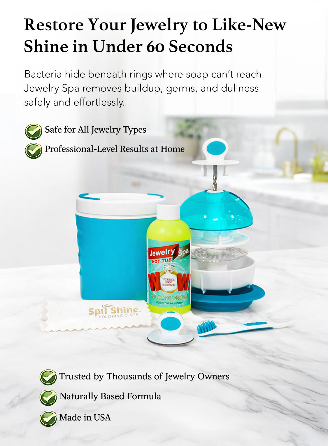 Bacteria hide beneath rings where soap can’t reach. Jewelry Spa removes buildup, germs, and dullness safely and effortlessly.